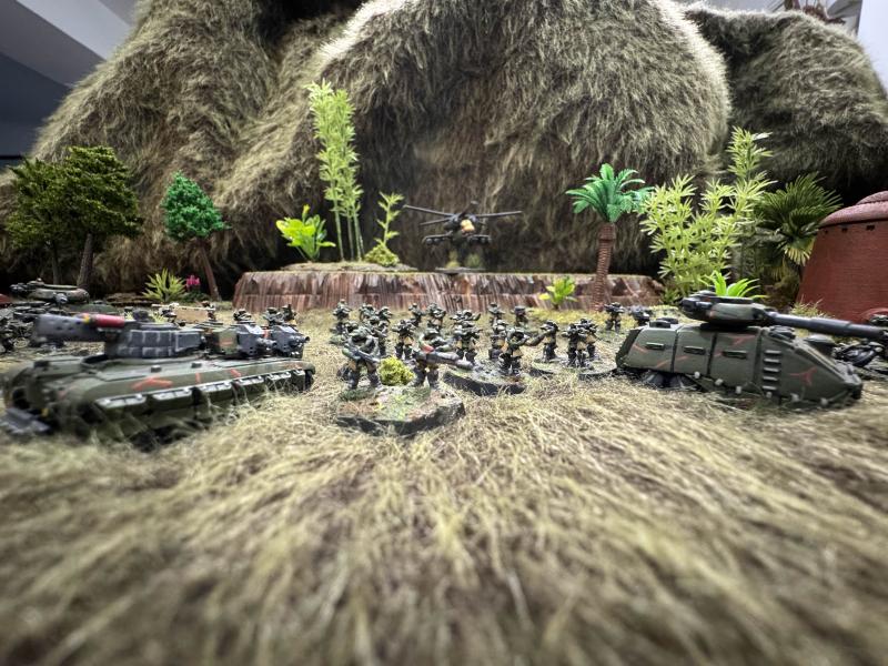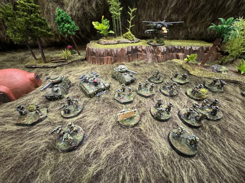 I really wanted to figure out what a force of jungle/swamp troops would look like. What would they need to move about? What equipment would they bring? The army was initially modeled after the US/Vietnam war. So it has a heavy reliance on ordinance, basic troops, automatic weapons, and flame weaponry. There is a small smattering of more special forces type units, but they are very much just a sprinkle. I also wanted a heavy focus on infantry and infantry vehicles (which is something I need more of). Basically, I wanted the army to be viewed with Fortunate Son playing in the background. My goal was for the army to feel “believable” on the table top, but also have some artistic bits to draw the eye. They are gaming pieces after all. I still have several models to paint to expand this army! A few more Jagers, some Copperheads, Rattlesnakes, Desert Vipers, Black Adders, Police Cobras, a Black Mamba, and a Naga.