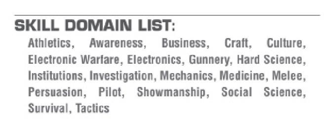 While a director may provide you with a list of skills, Heavy Gear does not have one inherent to the game. Instead you will pick from one of twenty categories – called Domains – and then name the Skill.