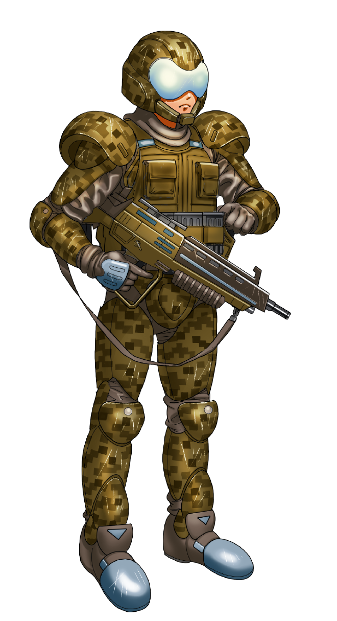 The PRDF was the first modern military on Terra Nova to adopt powered armor for standard use after reports from the Black Talons showed the popular stereotypes of its inadequacy were false. The Pilum is still primitive compared to its colonial counterparts, and is essentially just turtleshell with an awkwardly integrated exoframe. Operators are advised to avoid sudden movements to prevent the servo-mechanisms from dislocating their limbs. (Power Armor, Bulky)