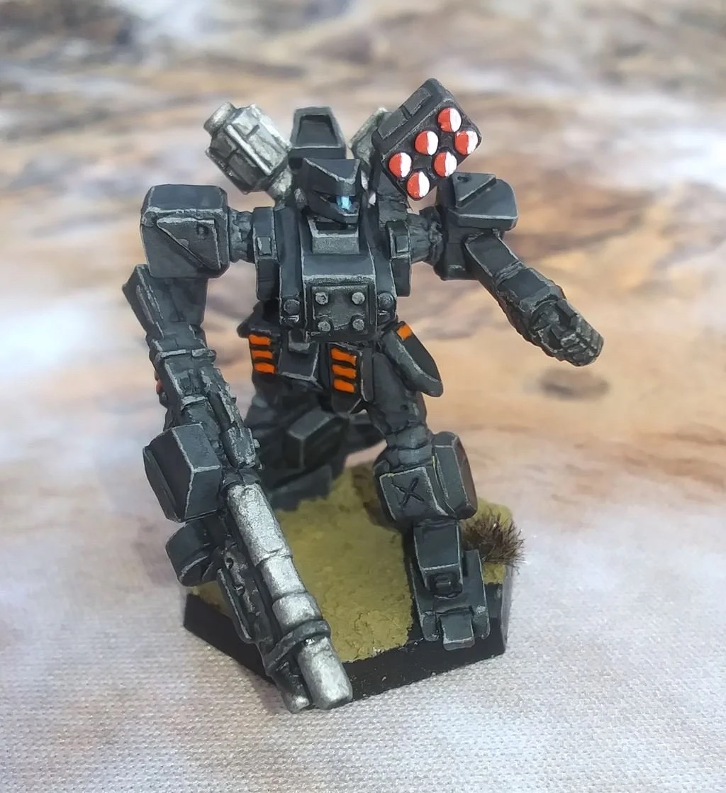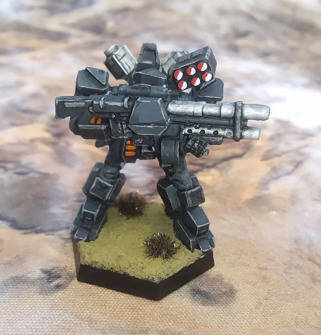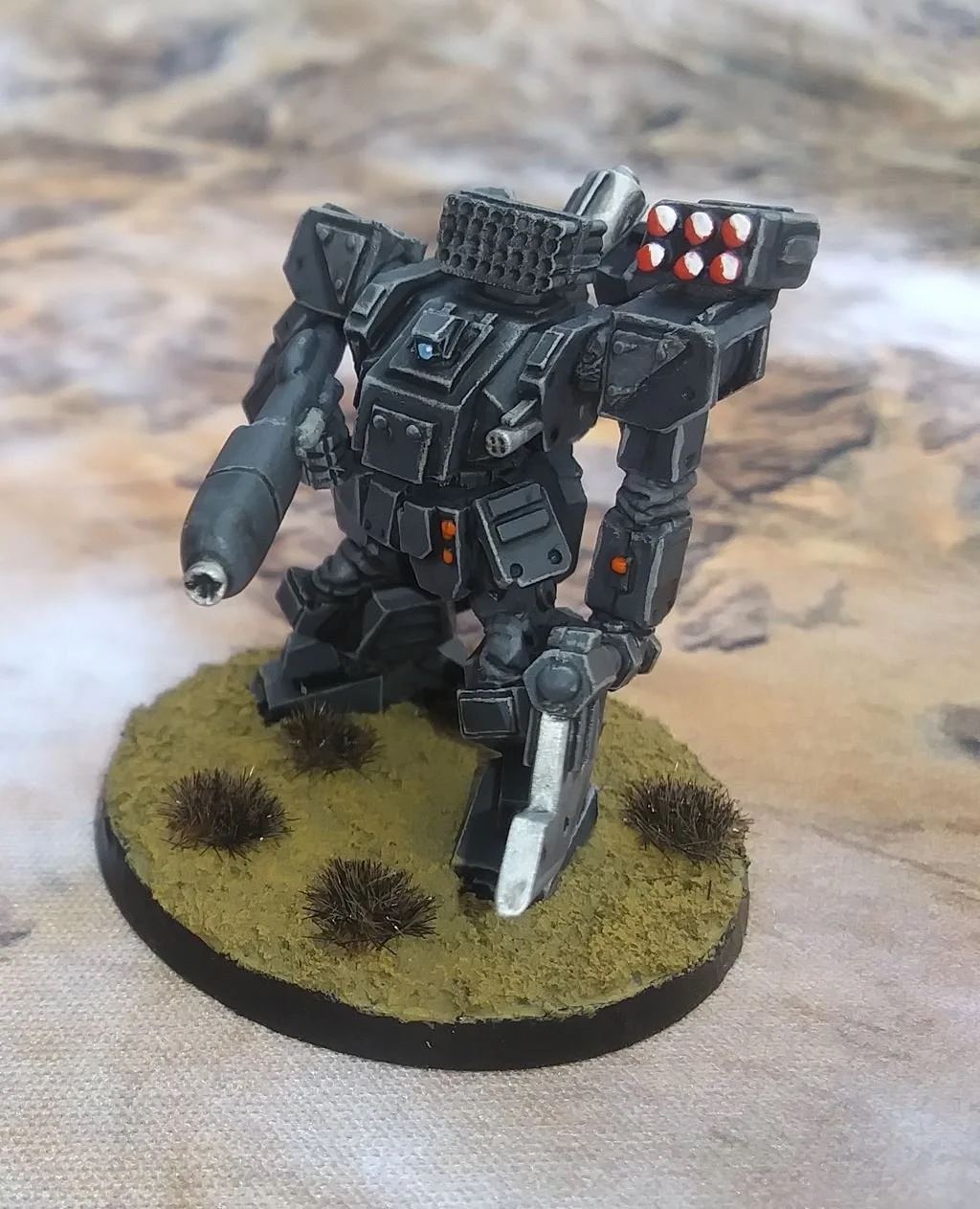 Nu variant, with rotary lasers and magnetized rotating turret, naturally. I was tempted to do the same with the front rotary gun but decided it wasn’t really worth it. Getting it to stand up stable was a little tricky as the front and back legs are slightly different shapes. I wanted to get an elevated look, like a Tachikoma. A surprising number of edges on it, I think it took me longer than any other Talon model at double the time.