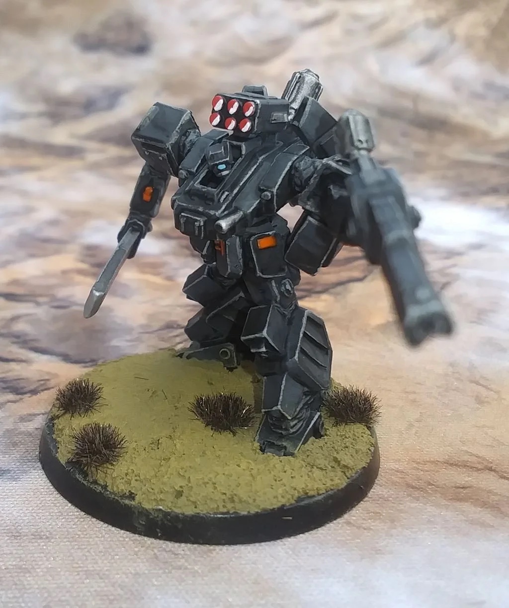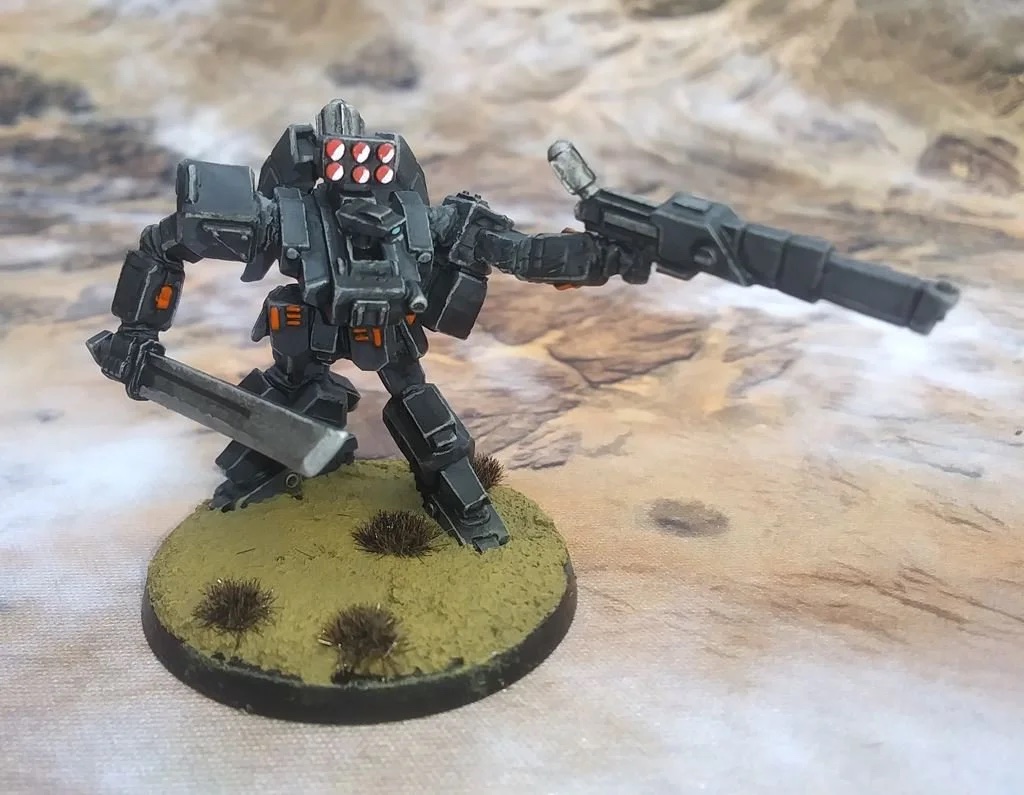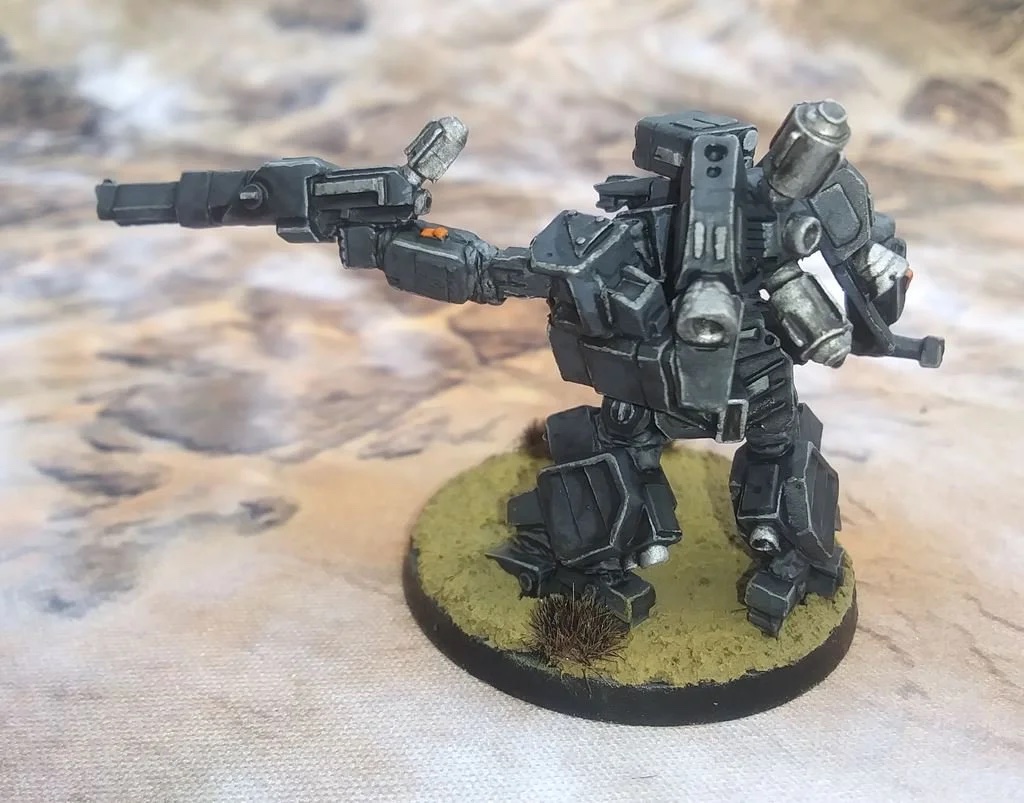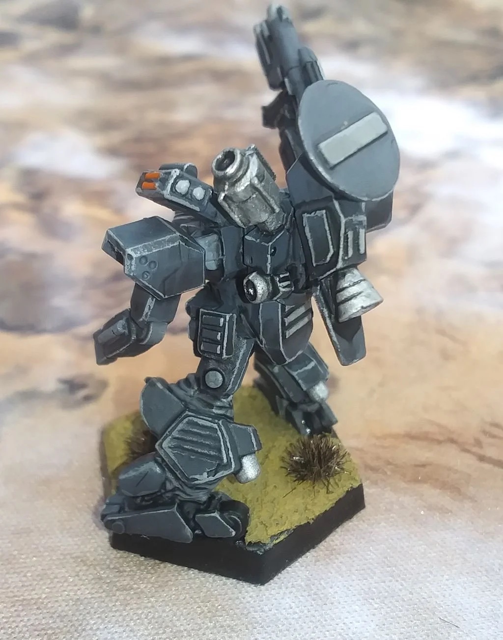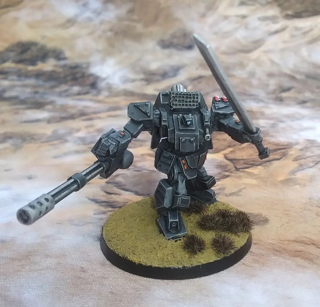 The favorite of favorites right here. The Omega + Theta loadout with light railgun and guided anti-tank missile rack, and of course big buster looking sword. It’s subtle, but there’s just enough contrapposto in the legs that it’s possible to carry through the rest of the model to get that ‘first moment of action’ look I most highly prize in a model. The railgun is also a cool unique element with a triangular shape that’s just very cool.