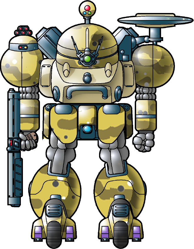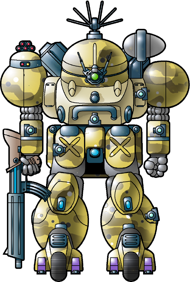 While the Silverscale variant of the Basilisk brought a certain amount of electronic warfare capability to the battlefield, the Black Box Silverscale was developed as a further step in that direction. Released in TN 1857, the Black Box mostly involved a modification of the electronics package of the Silverscale. Compared to that variant, the Gear was combat-shy, having shed its Vogel-6 rocket pod in favor of a shoulder mounted electronic counter-measures pod. The Silverscale’s target designator was also removed since it has little to do with the operational profile of the Black Box. Additional electronic warfare antennae were fitted to the outside of the Black Box’s body, making it a visually distinctive Gear. Together with the improved sensor and communications packages provided in the standard Silverscale, the Black Box was able to make a dangerous and effective electronic warrior out of the straightforward Basilisk. The Gear nonetheless had several important weaknesses, including the vulnerability of the shoulder-mounted electronic warfare pod to damage during combat. The offensive capabilities of the model were limited as well, making it difficult for the Gear to accompany an assault force.