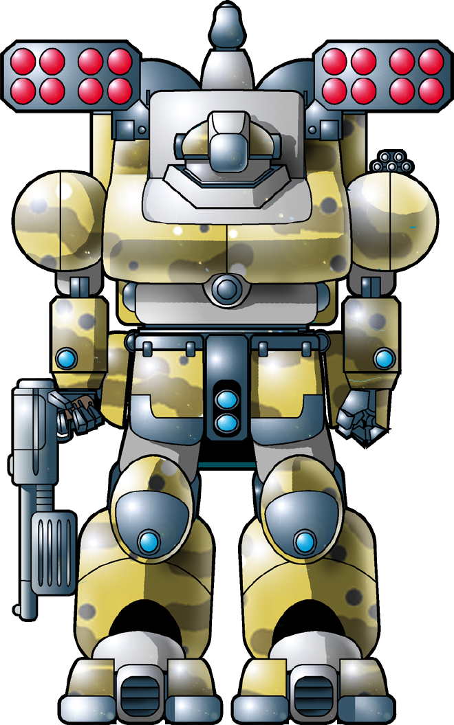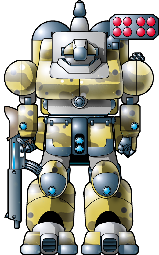 The Wasserjäger was the first Gear designed to patrol the Republic’s territorial waters. Based on a heavily modified Jäger chassis, the Wasserjäger is fully sealed and compartmentalized against leaks while submerged. A water-tight version of the hand-held 30mm PR-55 autocannon provides most of the Wasserjäger’s firepower when it is on dry land. While submerged, a shoulder-mounted Standard-XII torpedo pod grants the Wasserjäger considerable underwater firepower. An HLB-16 APGL and a HHVB-3 vibroknife round out the weapons array. This Gear lacks the usual wheeled feet of most Gears and instead has submarine jets on the feet and backpack to maneuver underwater. Powerful batteries and oxygen compressors allow the Gear to remain submerged for hours before needing to rise near the surface and extend its engine snorkel.
