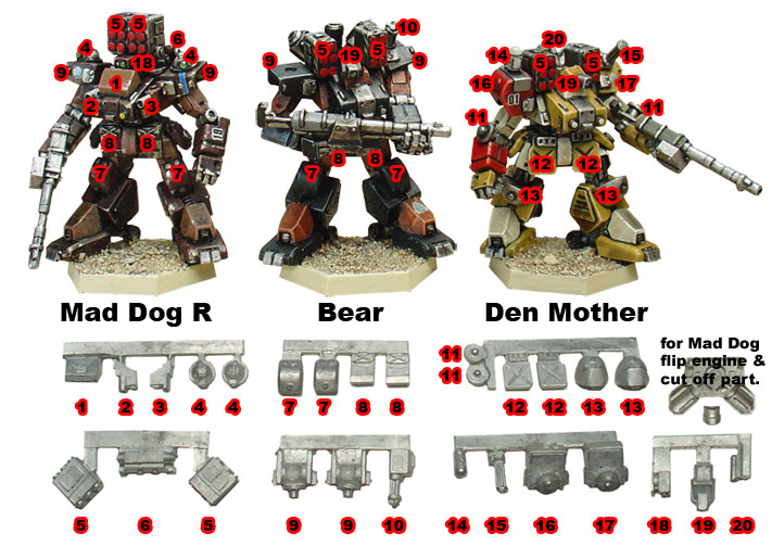 MetalThese models have recently been replaced by 3d-printed versions, but the older models are still available. This is taken from the page on the main dp9 website. The Den Mother is now an upgrade for the basic Bear design: Feel free to have fun with the various parts if you want. Note that the Mad Dog and Bear use the same engine, but on the Mad Dog it should have the central exhaust remoed and is mounted upside down.