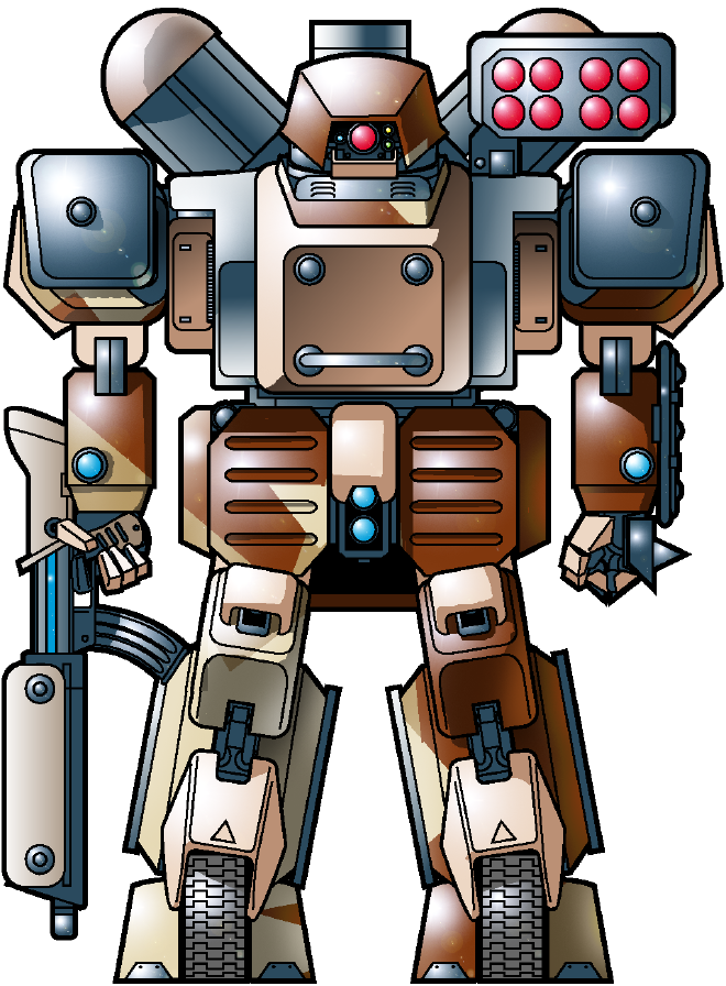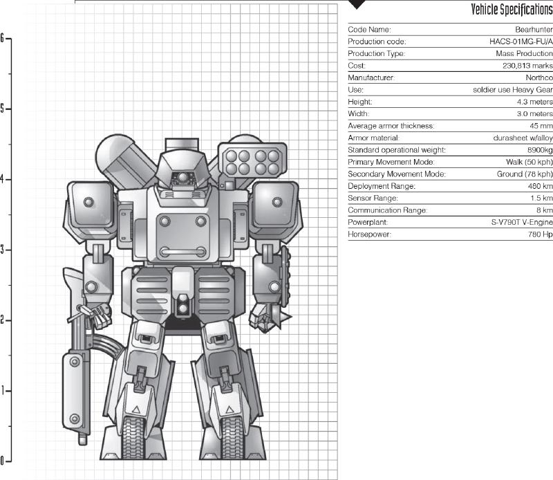 During a brief exercise with another unit, one of the technicians of the 33rd happened to work on a Bear fire support Gear. He was startled to discover that the engine, while a bit larger, had a very similar layout to the S-V950B. Power lines were close by and drive shafts at about the same diameter. After talking it over with the chief tech, the 33rd’s commander, Allan Gutarn, arranged to have an S-V790T powerplant requisitioned. The physically larger but more efficient engine, stripped from a decommissioned Bear, was hastily bolted into one of the 33rd’s Armored Hunter. The consequent improvement in performance was startling, and the Bearhunter was born. The S-V790T is larger than the engine compartment would permit, so new engine cowlings had to be designed. Many Bearhunters go around the problem by using the entire Bear backpack assembly. Unfortunately, the new Armored Hunters now suffer from the same engine shutdown problems as their Bear predecessors. Bearhunter pilots consider this a minor flaw. The modified machines of the 33rd HG regiment are now prized by their pilots.