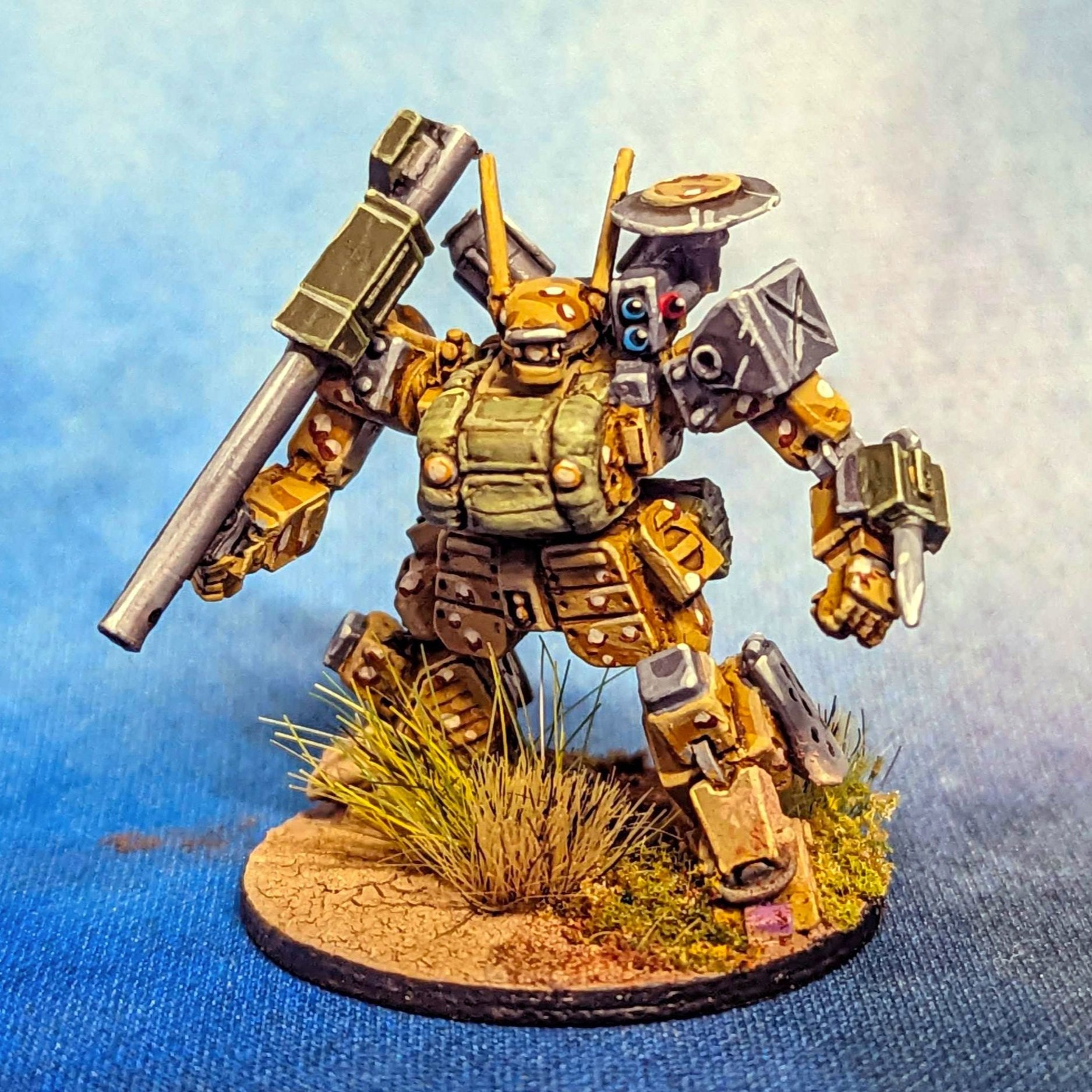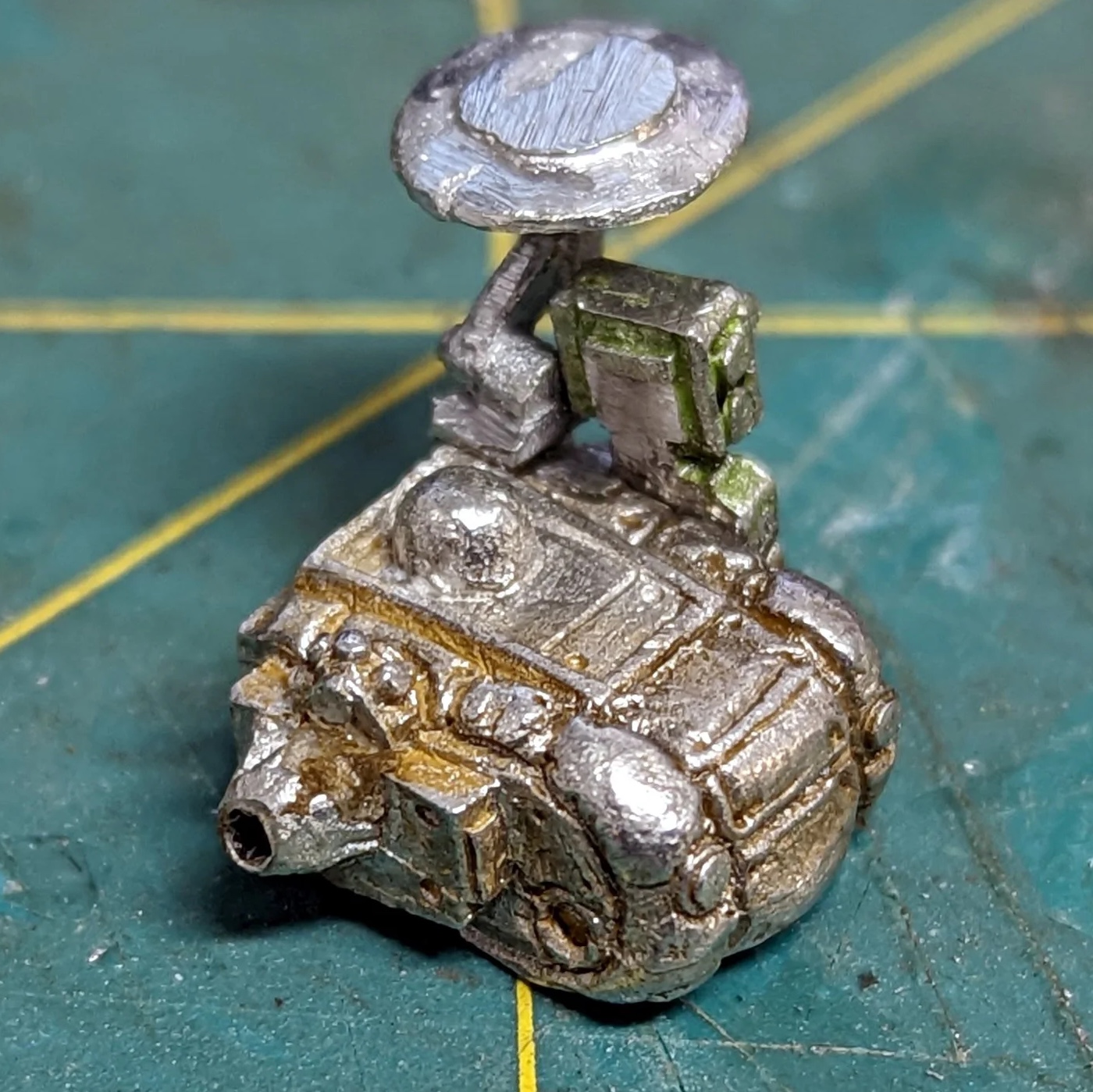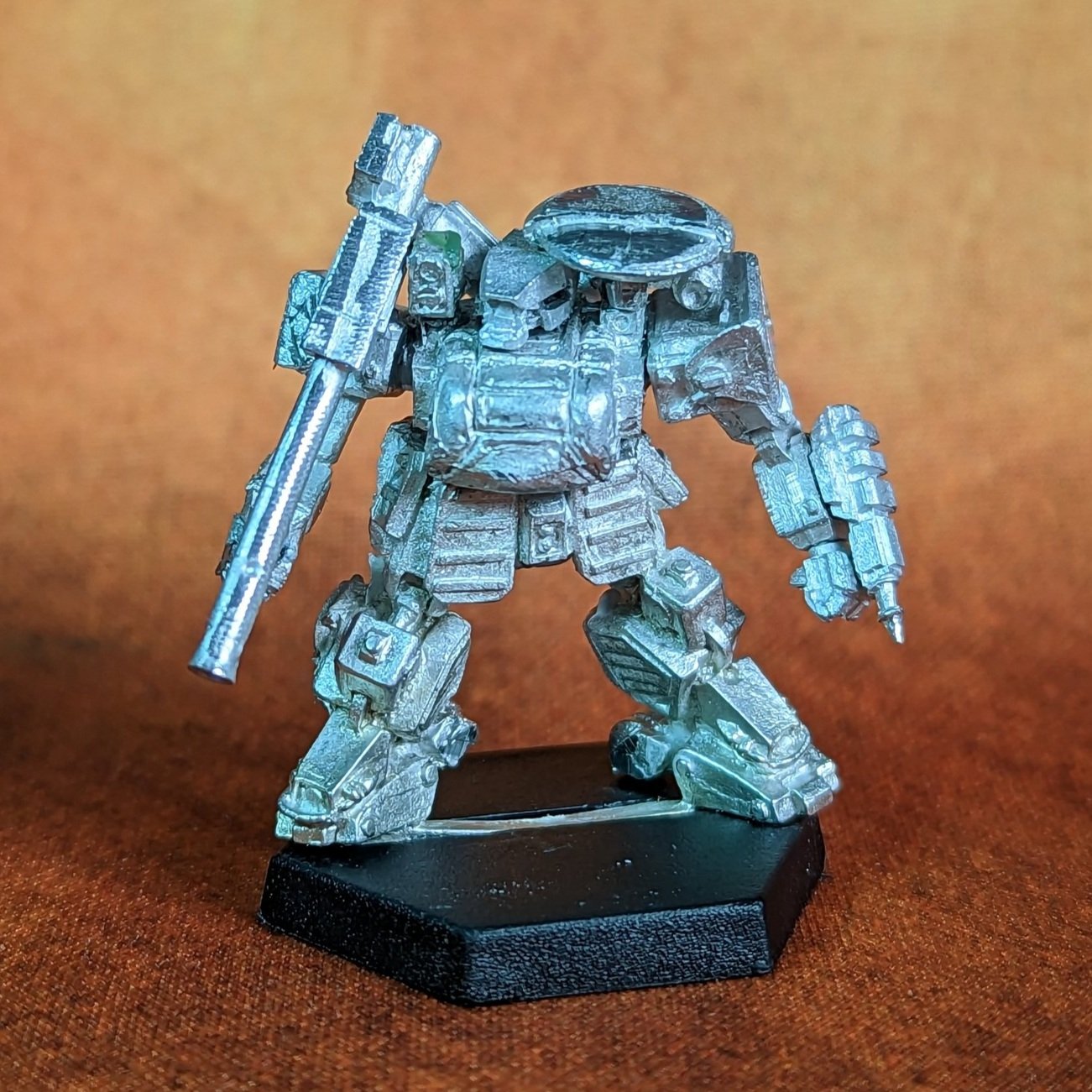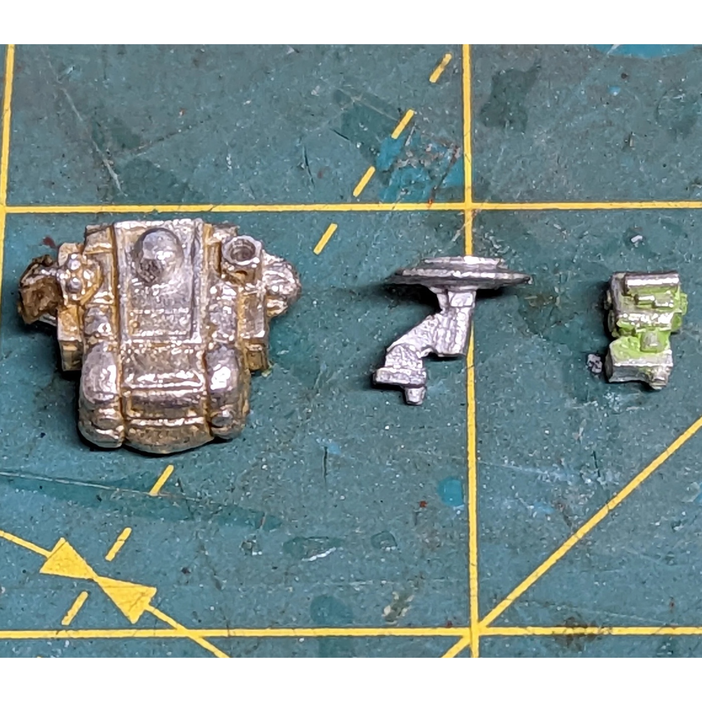 Since the lore mentions reusing pilfered Chatterbox parts, I thought I’d see if I could make these parts fit. I started with the Arena Hunter Commando, and filed the rocket pack mount off of the torso. Then I filed down the back and bottom of the ECM pod of a Chatterbox Iguana, and mounted that far forward on the left shoulder area. Behind that, I simply attached the satellite dish from the Chatterbox Iguana sprue. The Arena Hunter Commando has an old-style Hunter head with large antennas, which I felt was perfect to add to the electronic warfare look.