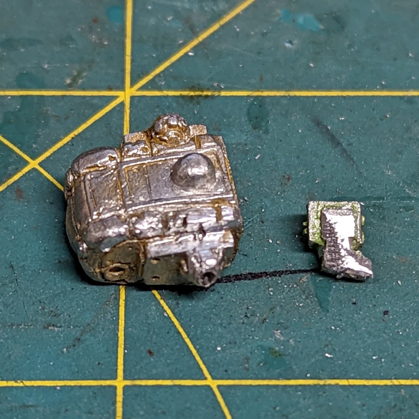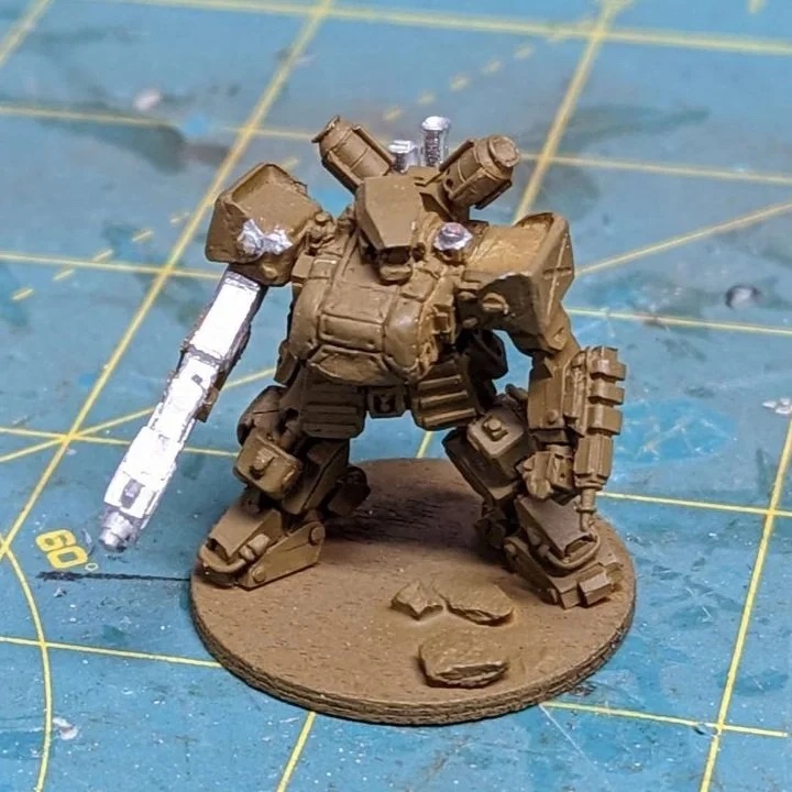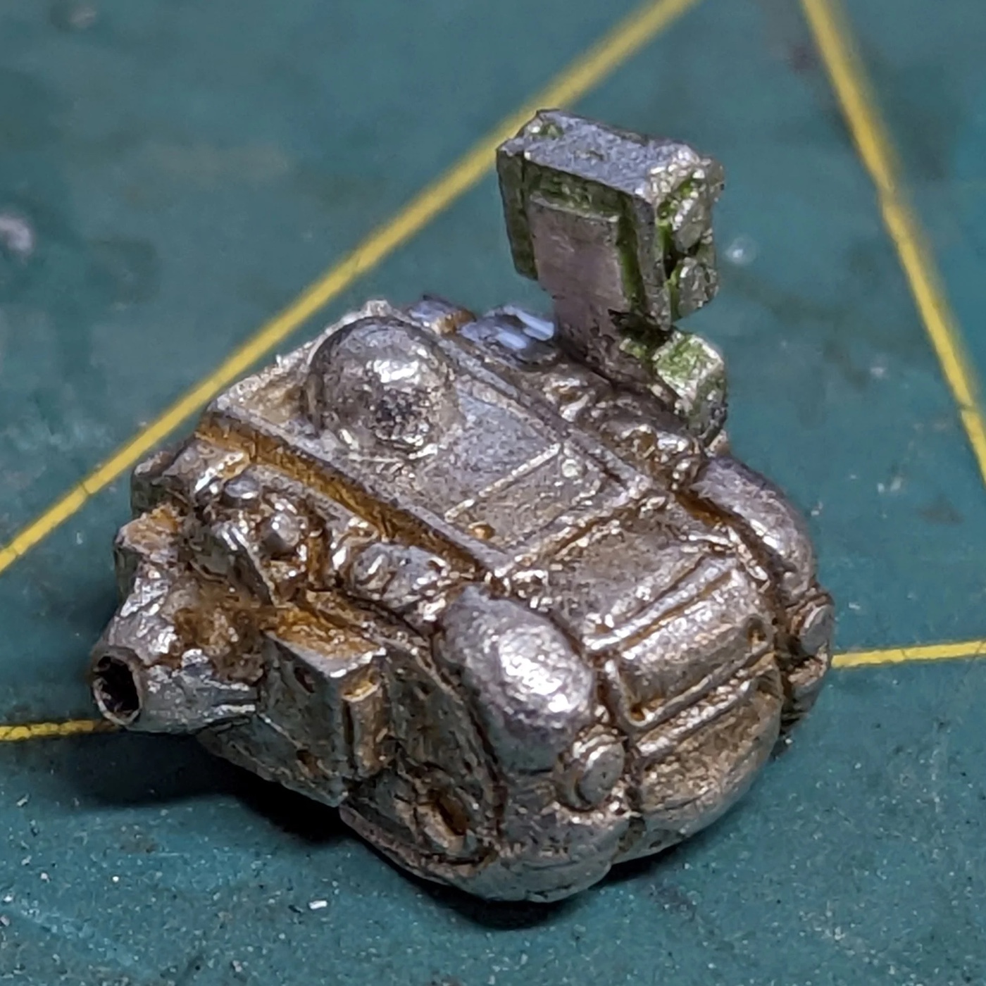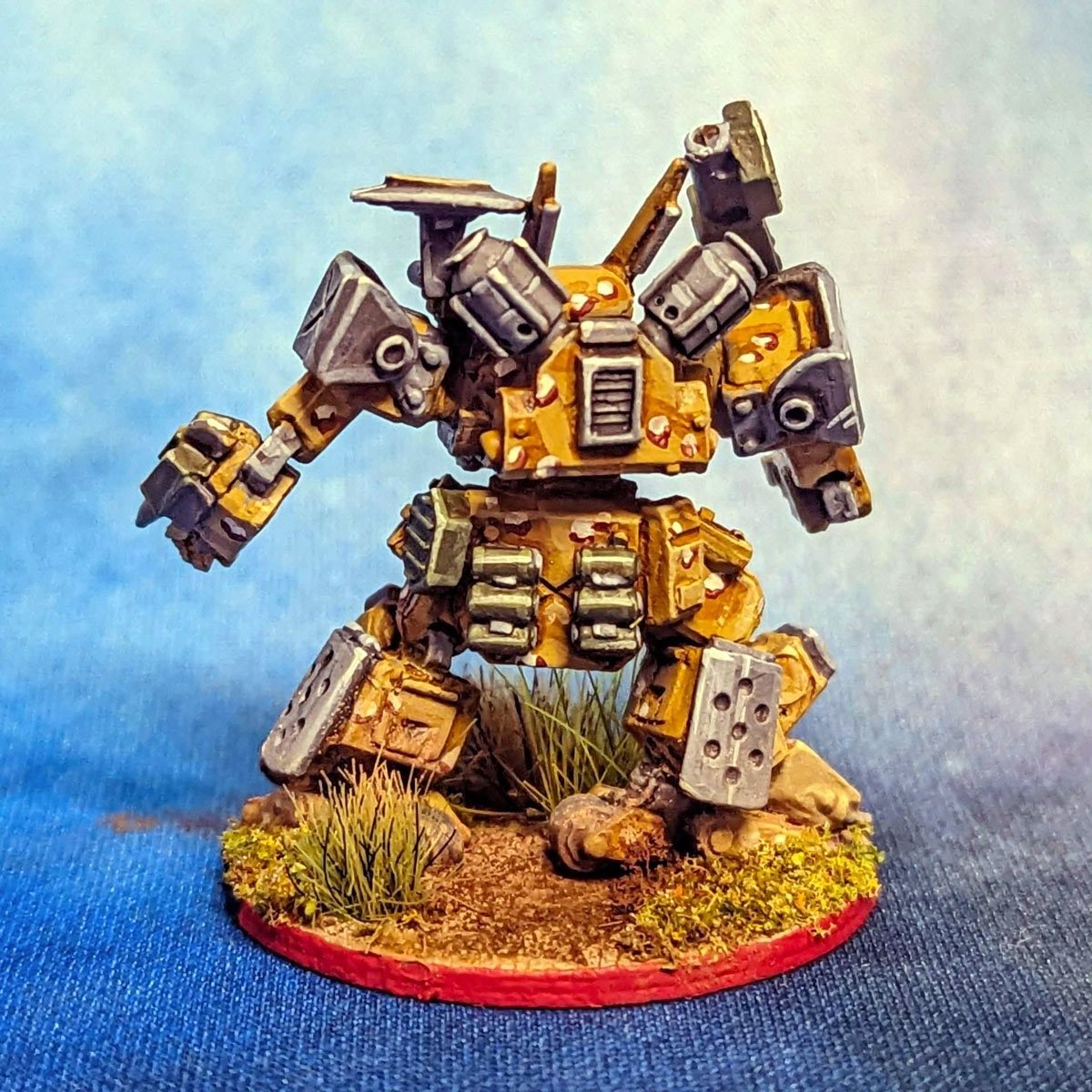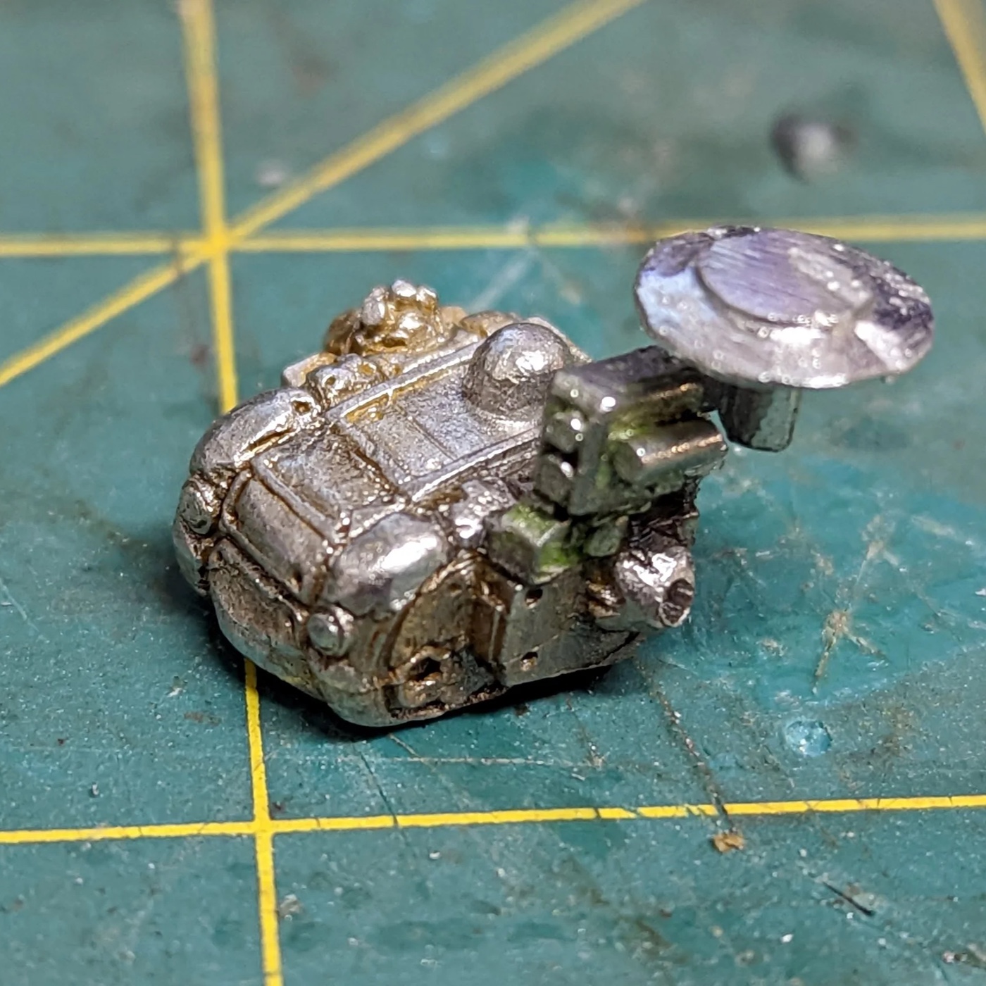 Since the lore mentions reusing pilfered Chatterbox parts, I thought I’d see if I could make these parts fit. I started with the Arena Hunter Commando, and filed the rocket pack mount off of the torso. Then I filed down the back and bottom of the ECM pod of a Chatterbox Iguana, and mounted that far forward on the left shoulder area. Behind that, I simply attached the satellite dish from the Chatterbox Iguana sprue. The Arena Hunter Commando has an old-style Hunter head with large antennas, which I felt was perfect to add to the electronic warfare look.