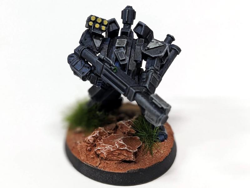 Next up, I dry bushed the whole model with Vallejo 73.601 - Grey Surface Primer and blocked off a few panels and equipment with the same colour. This makes the black look even better framing the mini with gentle edges to enhance the effect the black over the blue base.