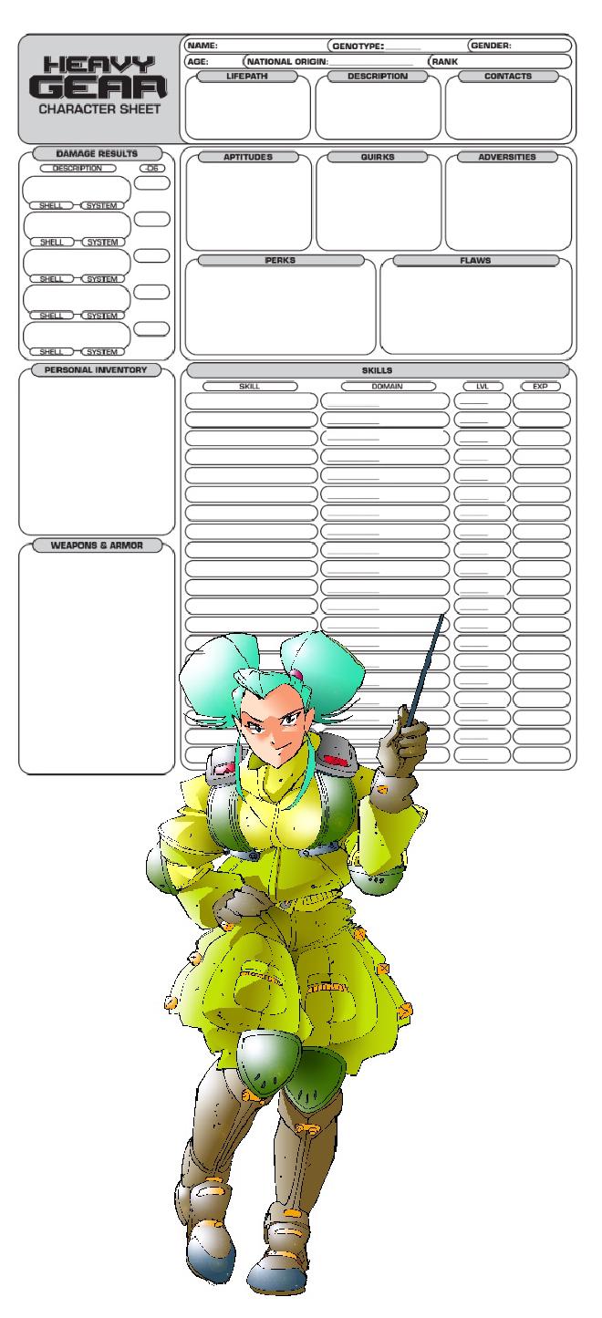 These Attributes make some categories of activity more (or less) reliable or provide direct numeric bonuses such as winning ties, having more system/shell shock, or a flat increase to move speed. They include equivalents for all ten basic attributes in earlier Heavy Gear editions but also account for social status, cybernetics, or even luck. Each Perk chosen must be balanced with an equal amount of Flaws, but there is no need to have any Attributes if you don’t want them. Some Attributes can also be gained or worked off over time as well.