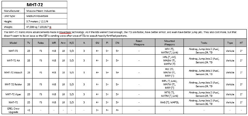 | MHT-72 AA | 29 | FS | H:8 | 10 | 5/3 | 3 | 4+ | 5+ | 5+ | - | HRL (T, AA), MABM (T), MATM (T) | Airdrop, Jump Jets:3 (Aux), Sensors:24, TD | Vehicle | 2" |