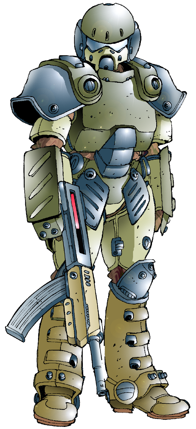A combat-adapted version of an ordnance disposal suit, designed to allow troops to survive artillery fire. Layers of armoplast-foam sandwich successfully disperse the effects of blastwaves, but also make the Shortstop so hot and uncomfortable that most troops refuse to put them on them unless under active bombardment. (Medium Flak, Full Suit, Explosive Hardened, Bulky)