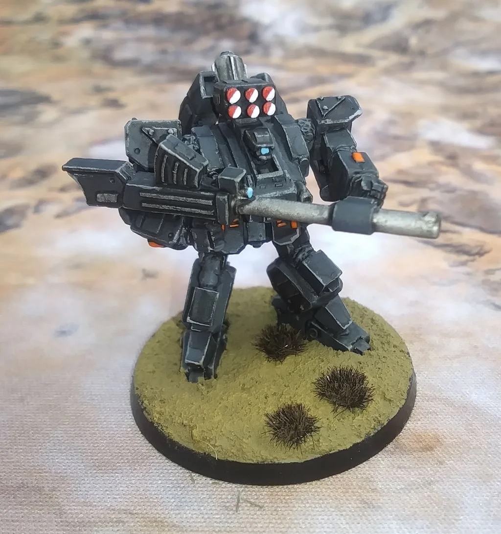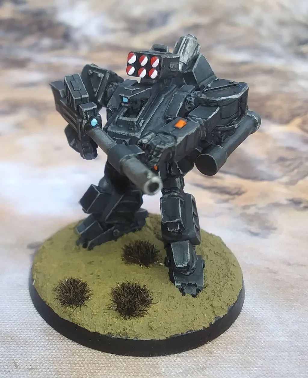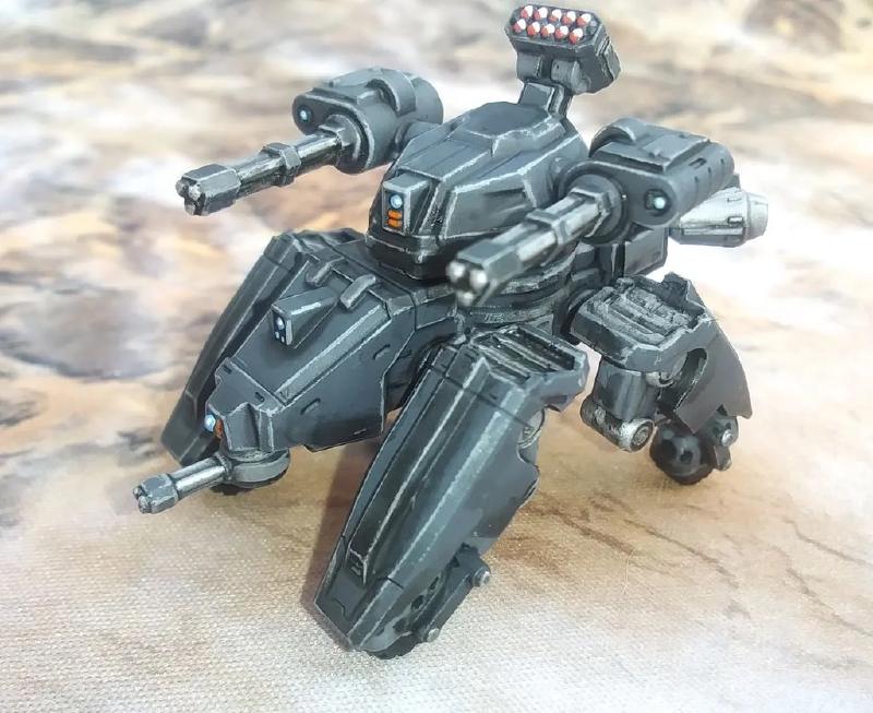 Nu variant, with rotary lasers and magnetized rotating turret, naturally. I was tempted to do the same with the front rotary gun but decided it wasn’t really worth it. Getting it to stand up stable was a little tricky as the front and back legs are slightly different shapes. I wanted to get an elevated look, like a Tachikoma. A surprising number of edges on it, I think it took me longer than any other Talon model at double the time.
