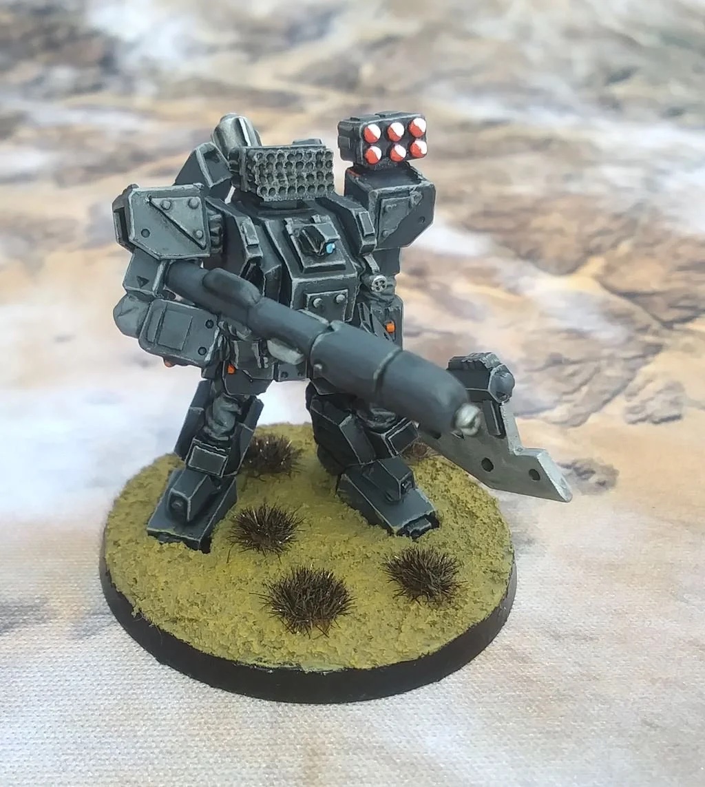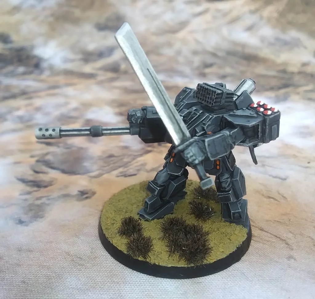 The favorite of favorites right here. The Omega + Theta loadout with light railgun and guided anti-tank missile rack, and of course big buster looking sword. It’s subtle, but there’s just enough contrapposto in the legs that it’s possible to carry through the rest of the model to get that ‘first moment of action’ look I most highly prize in a model. The railgun is also a cool unique element with a triangular shape that’s just very cool.