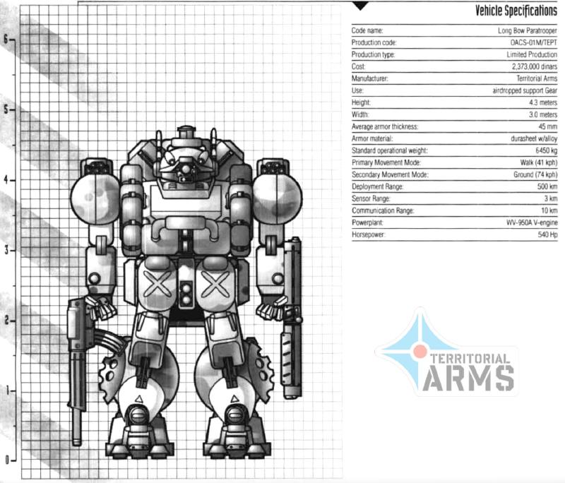 The Longbow Jäger was as good an inexpensive rifleman Gear as could be achieved for its price, and yet many tinkered with the concept. Based on the versatile Jäger chassis, the Longbow was sturdy, reliable, and easily modified to reflect the tasks required of it. It was thought that merging some of the characteristics of the Longbow with those of the paratrooper variant would make it more mobile than before and able to tackle a greater variety of missions. The resulting hybrid presents characters from both models and some improvements of its own. Making the Gear airdroppable allowed it to target important commanders and crucial objectives such as supply dumps, who are normally found well within the rear lines. Because of the more dangerous nature of this duty and the wider target selection, the Longbow had its regular mortar replaced with a version firing light guided projectiles which can home in on targets designated by the Gear’s cadremates. The Paratrooper also carries a pack gun for situations which might require the use of automatic weapon fire. The sensor suite has been upgraded to increase its resolution, making it easier to acquire targets in difficult weather.