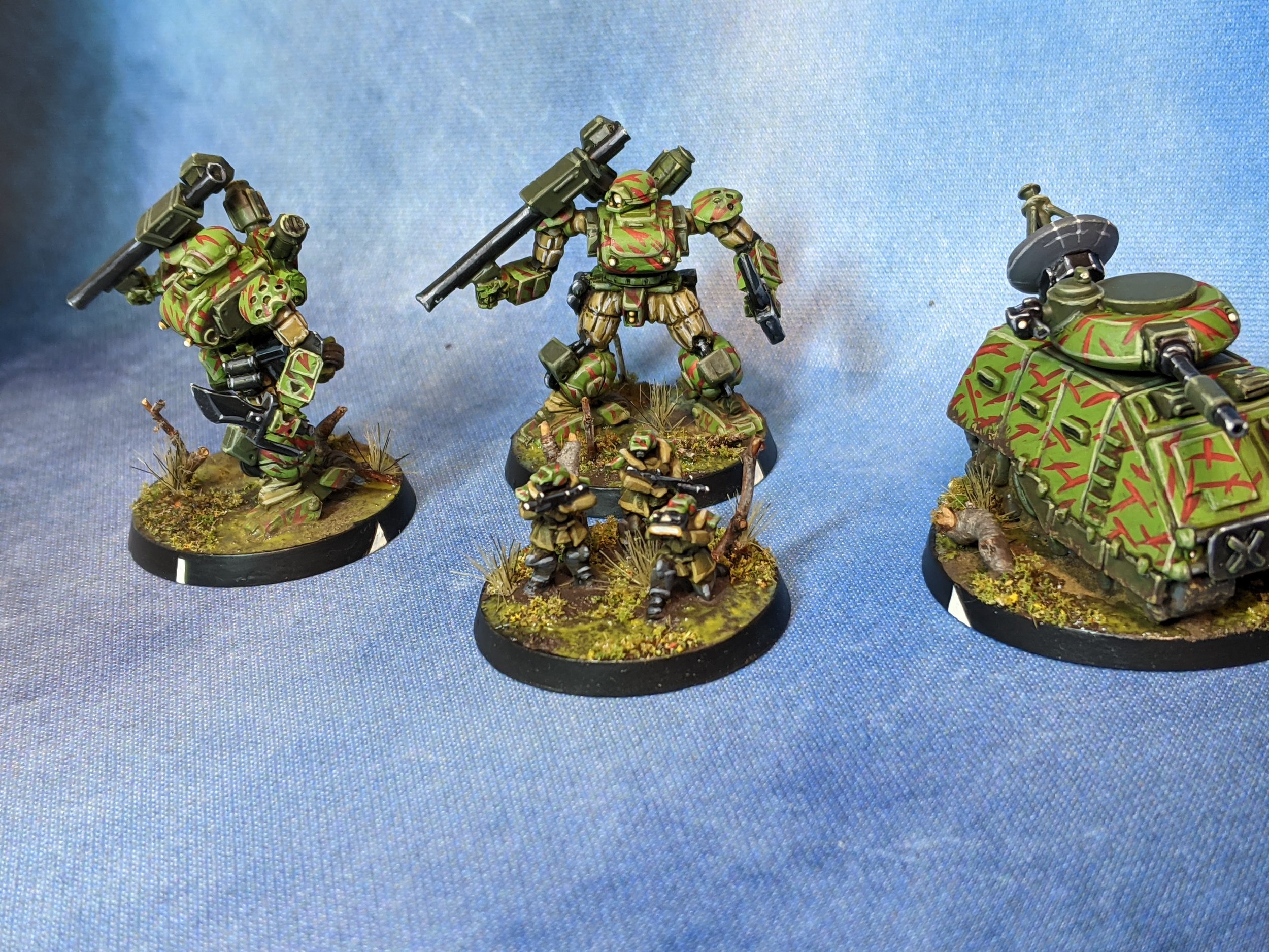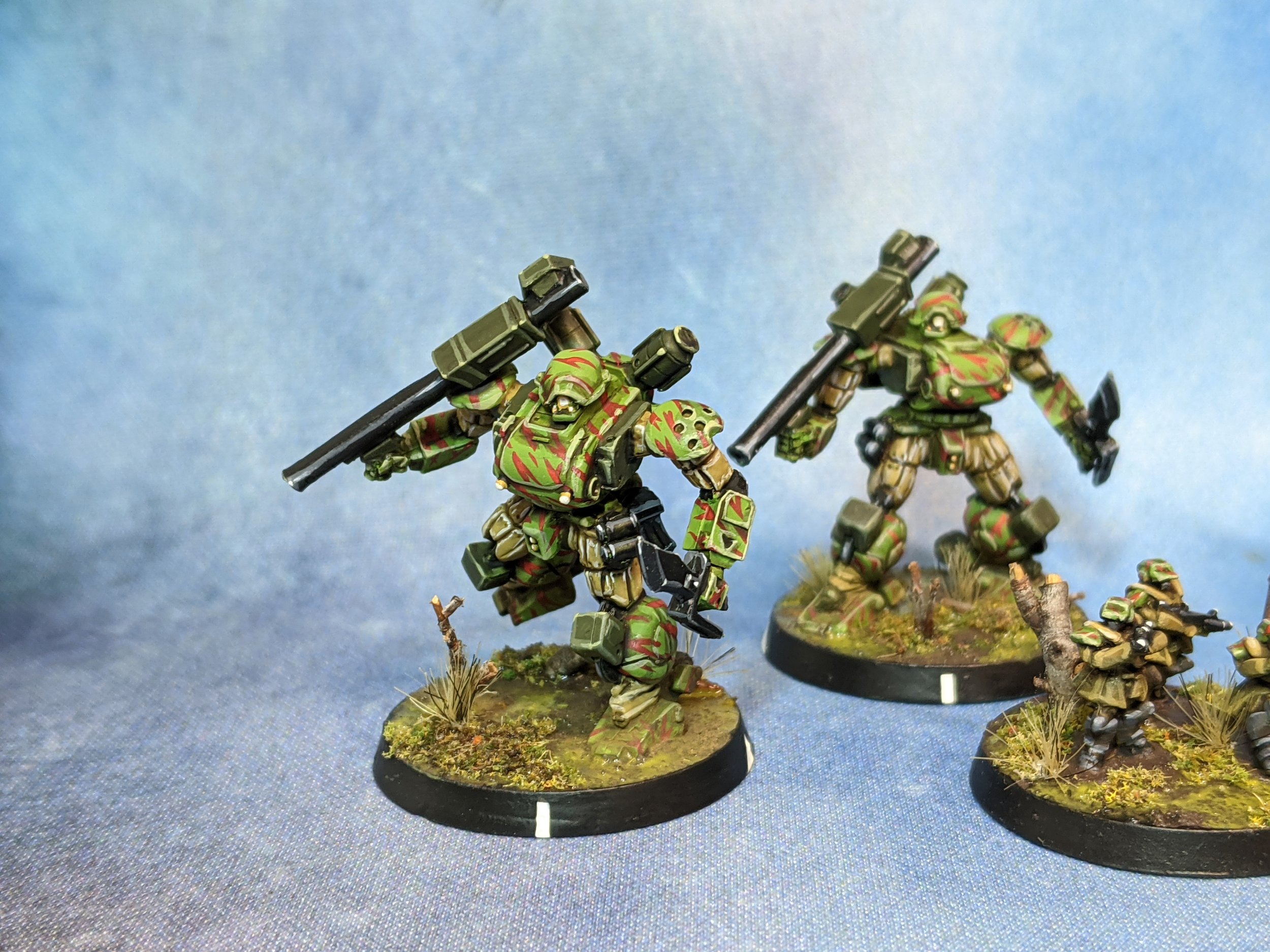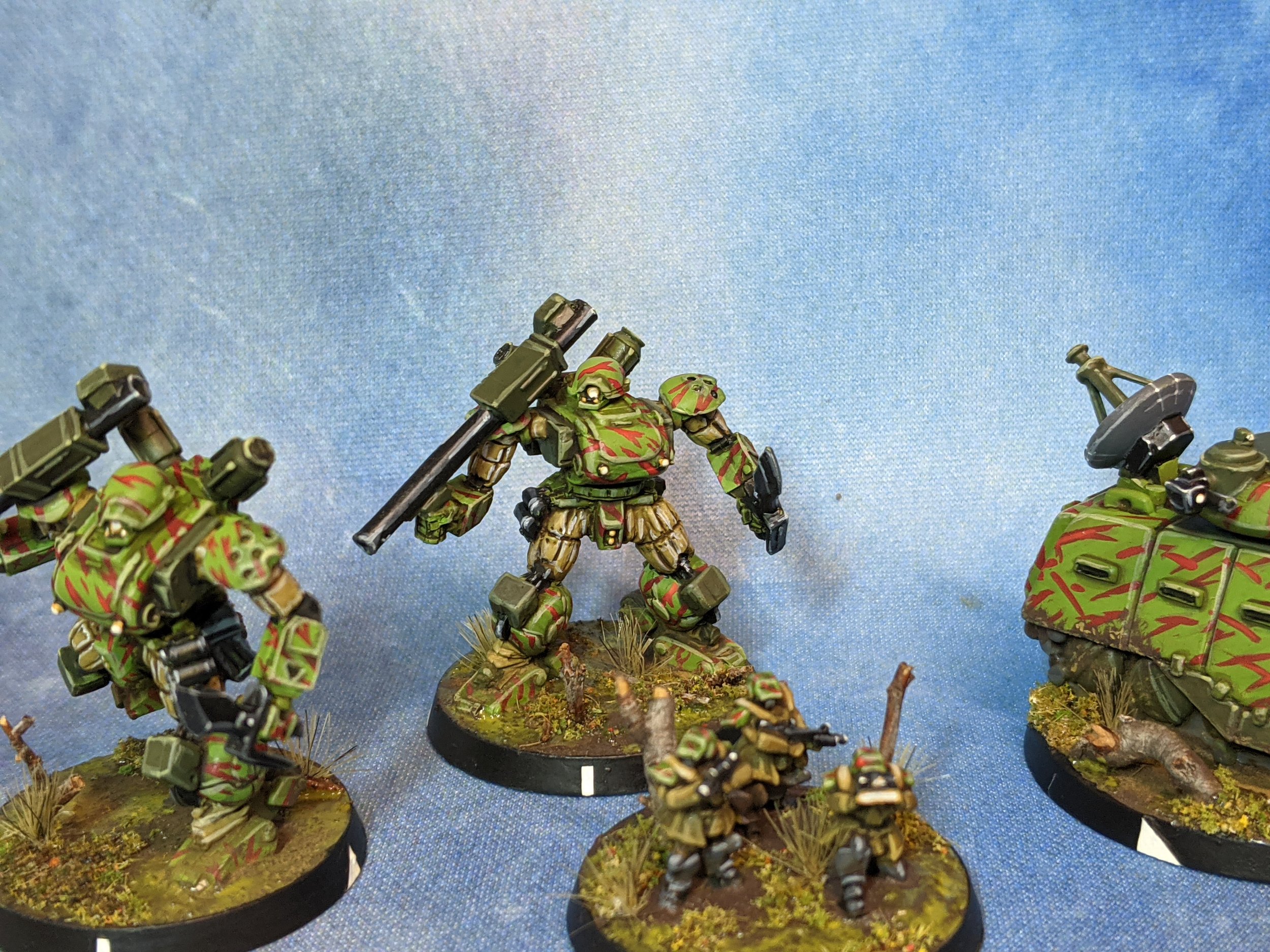 I took inspiration for my camouflage scheme from another old Blitz source, which showed a red stripes over green pattern for swamp camouflage. To break up the design, I incorporated blocks of olive, black, and khaki, leaving the green camouflaged armor for the sturdiest bits. When painting the infantry, I went with a green-brown color for the coats, but died them into the rest of the army by painting their helmet with a similar green and red pattern. I’ve found that when you’re painting camouflage schemes, it’s important to break up the areas of the model, otherwise the camouflage does it’s job and it all blends together! While that’s more realistic, it’s a bit less appealing on a mini.