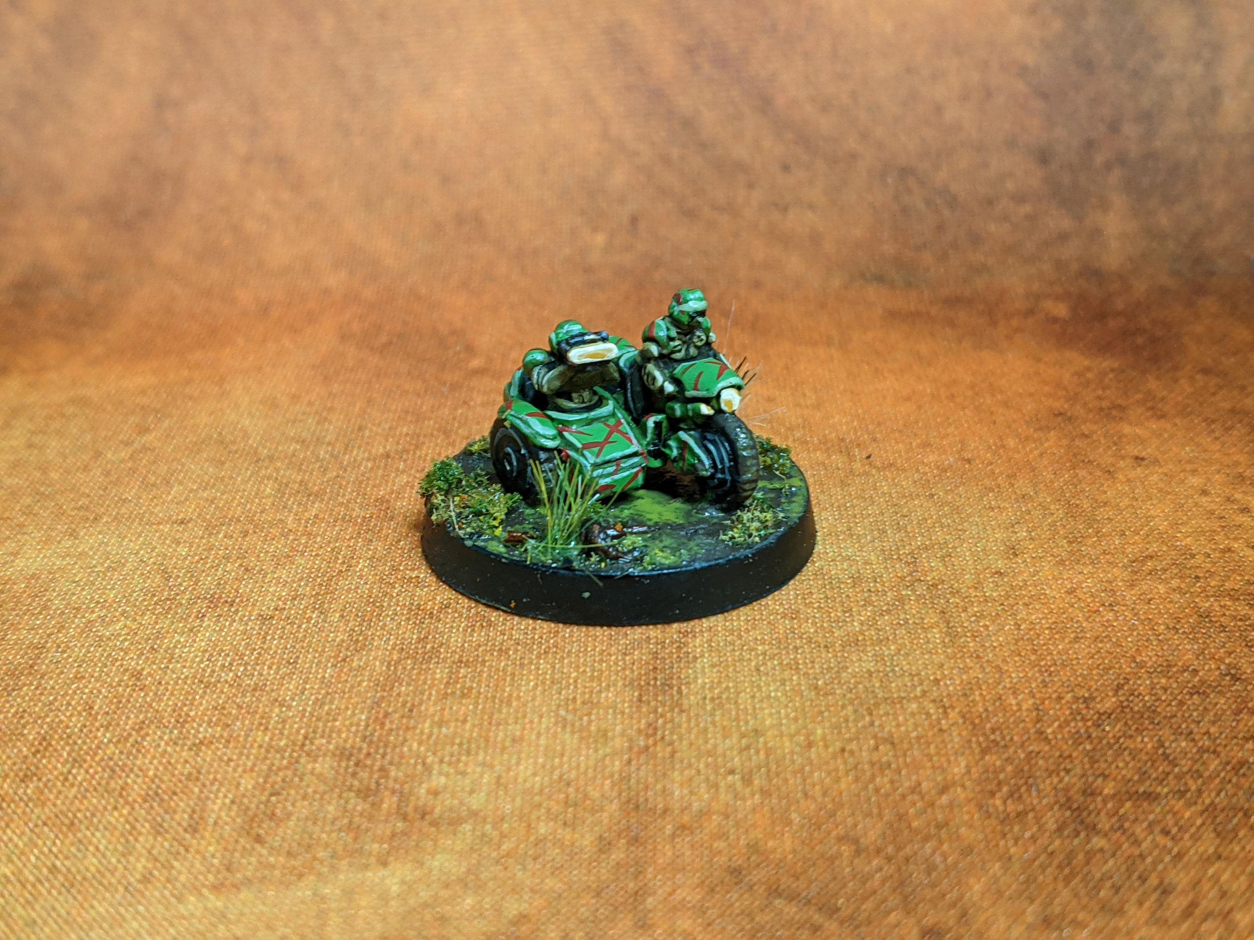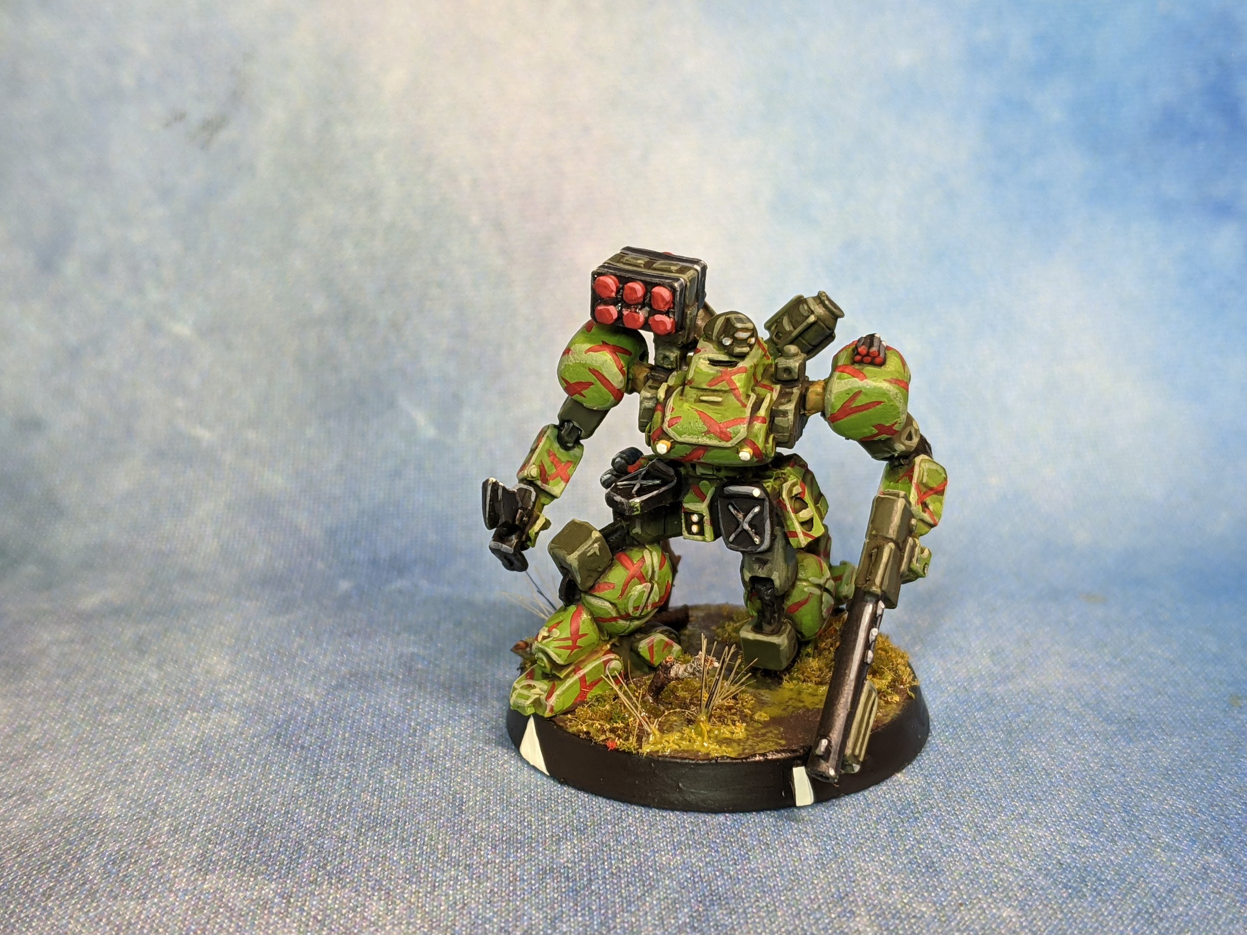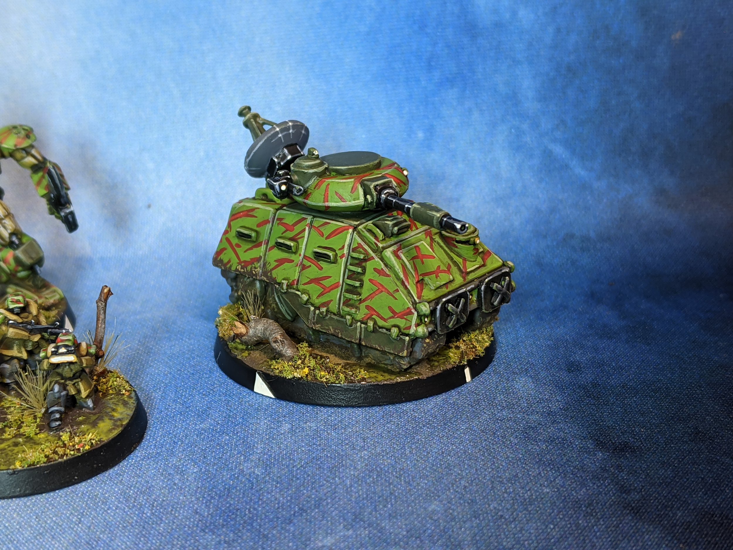 I took inspiration for my camouflage scheme from another old Blitz source, which showed a red stripes over green pattern for swamp camouflage. To break up the design, I incorporated blocks of olive, black, and khaki, leaving the green camouflaged armor for the sturdiest bits. When painting the infantry, I went with a green-brown color for the coats, but died them into the rest of the army by painting their helmet with a similar green and red pattern. I’ve found that when you’re painting camouflage schemes, it’s important to break up the areas of the model, otherwise the camouflage does it’s job and it all blends together! While that’s more realistic, it’s a bit less appealing on a mini.